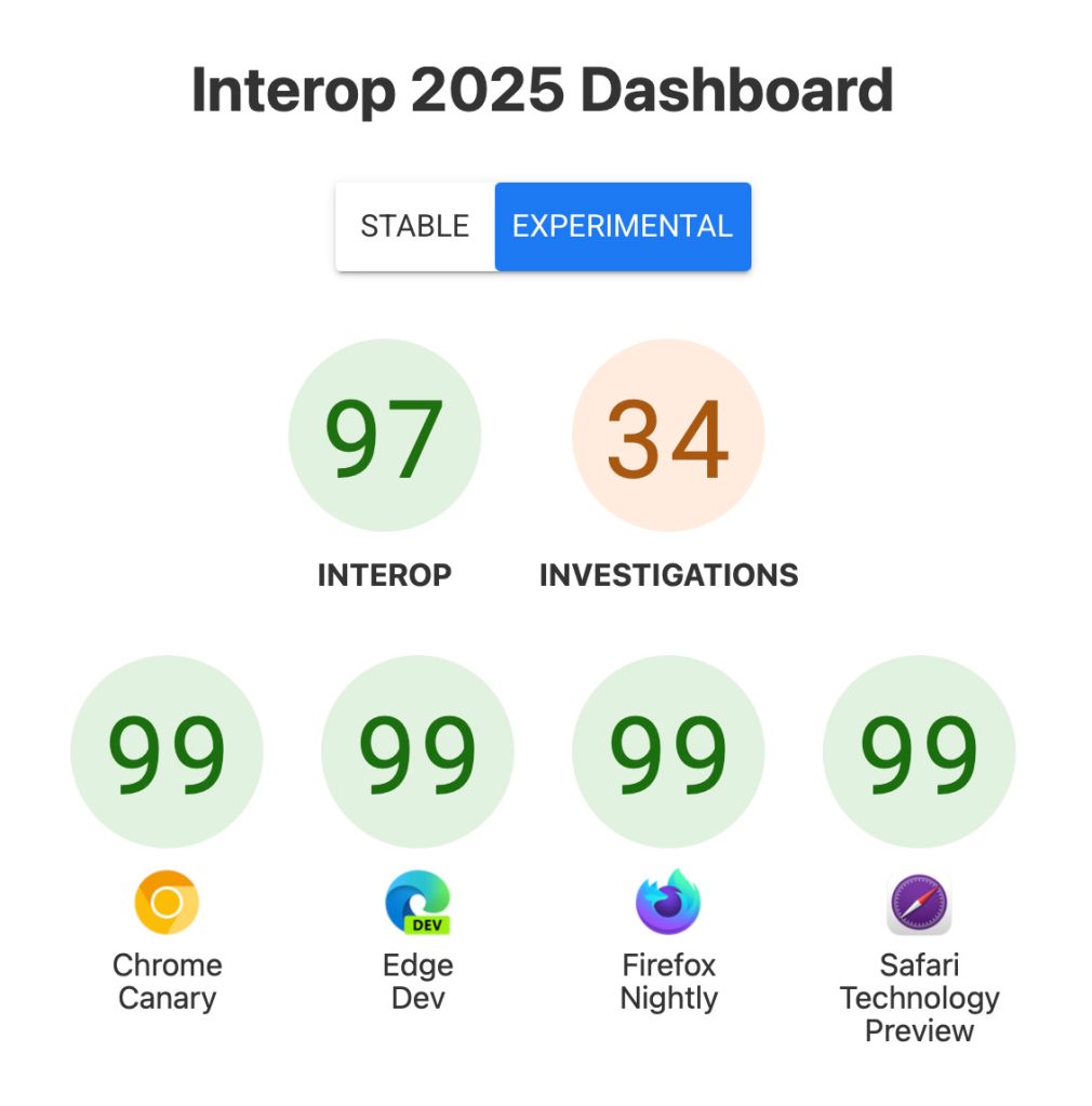 E embora apenas 29% dos testes selecionados tenham sido aprovados em todos os navegadores no início do ano, essa taxa de aprovação disparou para 97% no final do ano, com “todos os quatro navegadores experimentais (Chrome Canary, Edge Dev, Firefox Nightly e Safari Technology Preview) atingindo 99%”.