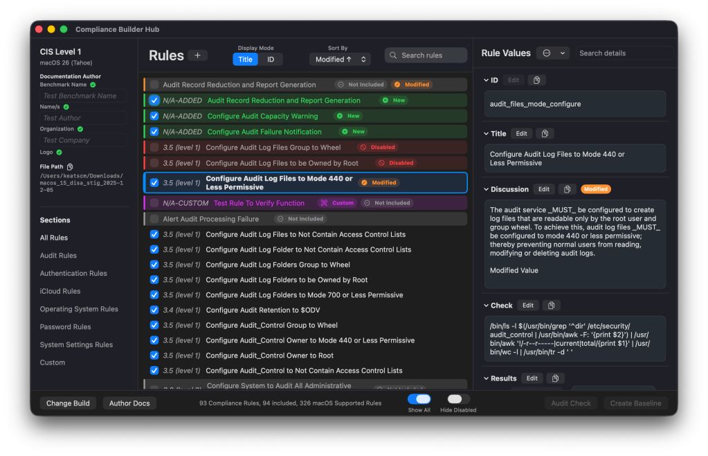 O MACE resolve isso agindo como uma interface gráfica de usuário para o mSCP. Em vez de procurar nas linhas de código para encontrar a regra que desativa a câmera do macOS ou impõe uma senha de bloqueio de tela, o MACE mostra esses controles em um painel. Você pode carregar uma linha de base padrão, como NIST 800-171 ou CIS Benchmark, e depois ativar ou desativar regras específicas com base nos requisitos da sua organização.