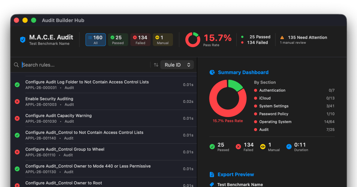 À medida que os requisitos de segurança se tornaram mais rigorosos nesta era da computação, a implantação de benchmarks de conformidade como CIS ou NIST tornou-se um foco significativo para administradores de TI. O MACE simplifica a complexidade desses padrões governamentais, agrupando-os em uma ferramenta utilizável e de código aberto que qualquer equipe de TI pode implantar.