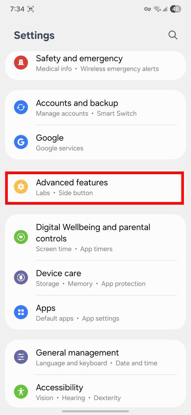 - . Navegue até Recursos avançados nas configurações da Samsung.