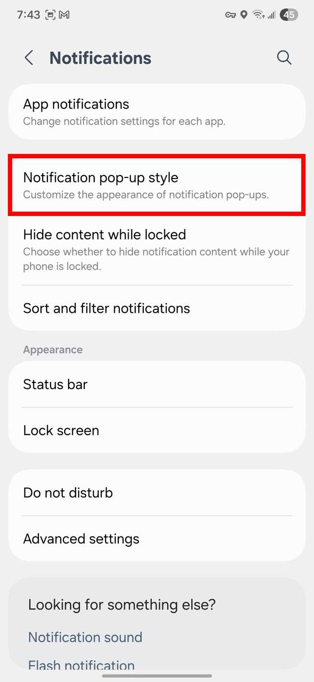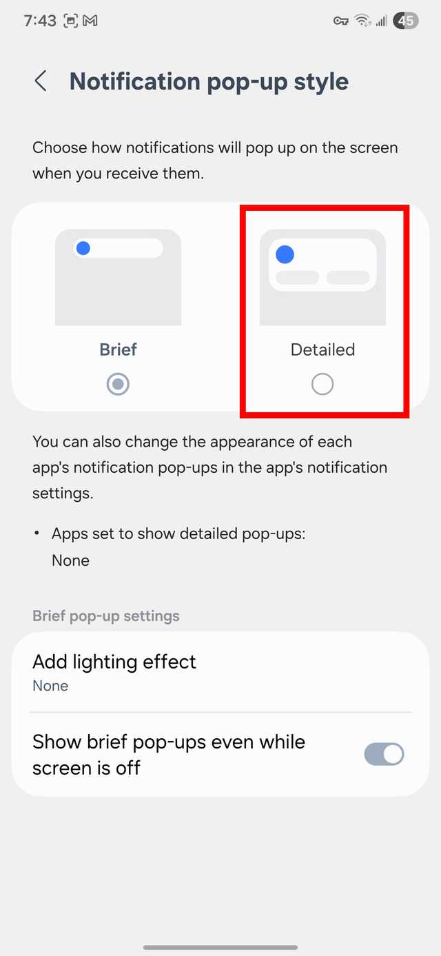 O design de aviso padrão da Samsung revela apenas um pequeno pop-up. Você pode alterá-lo para o pop-up completo típico do Android em Configurações.