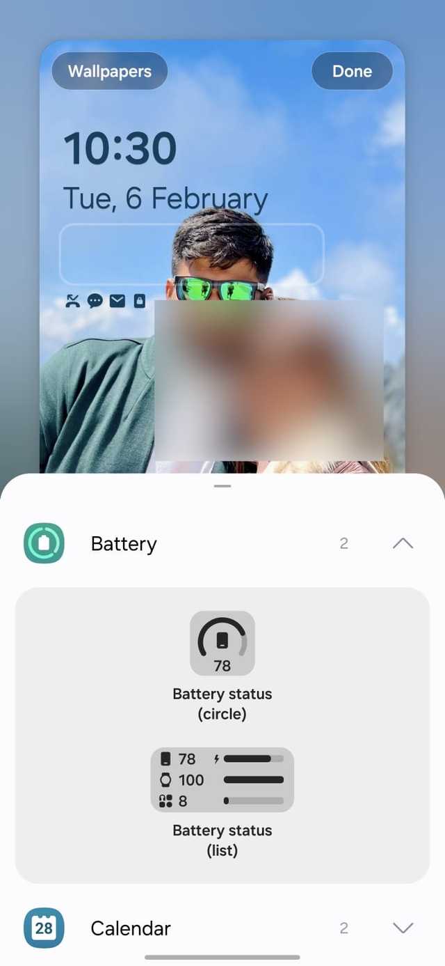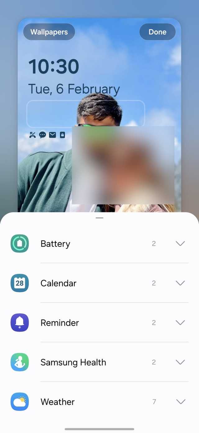 Desde o One UI 6.1, a Samsung incluiu suporte para widgets de tela de bloqueio listados abaixo do símbolo do relógio.