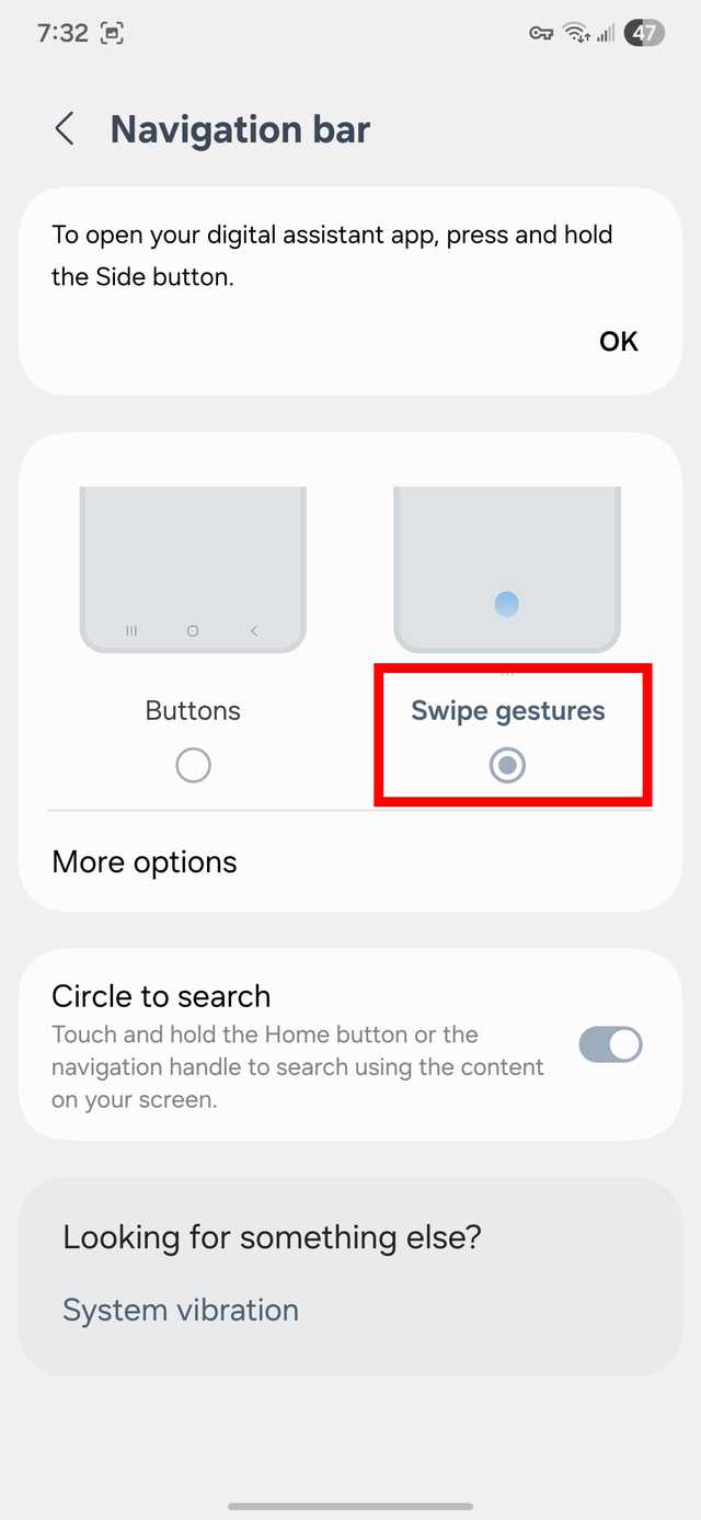 - . Toque no botão de rádio listado abaixo Deslizar gestos.