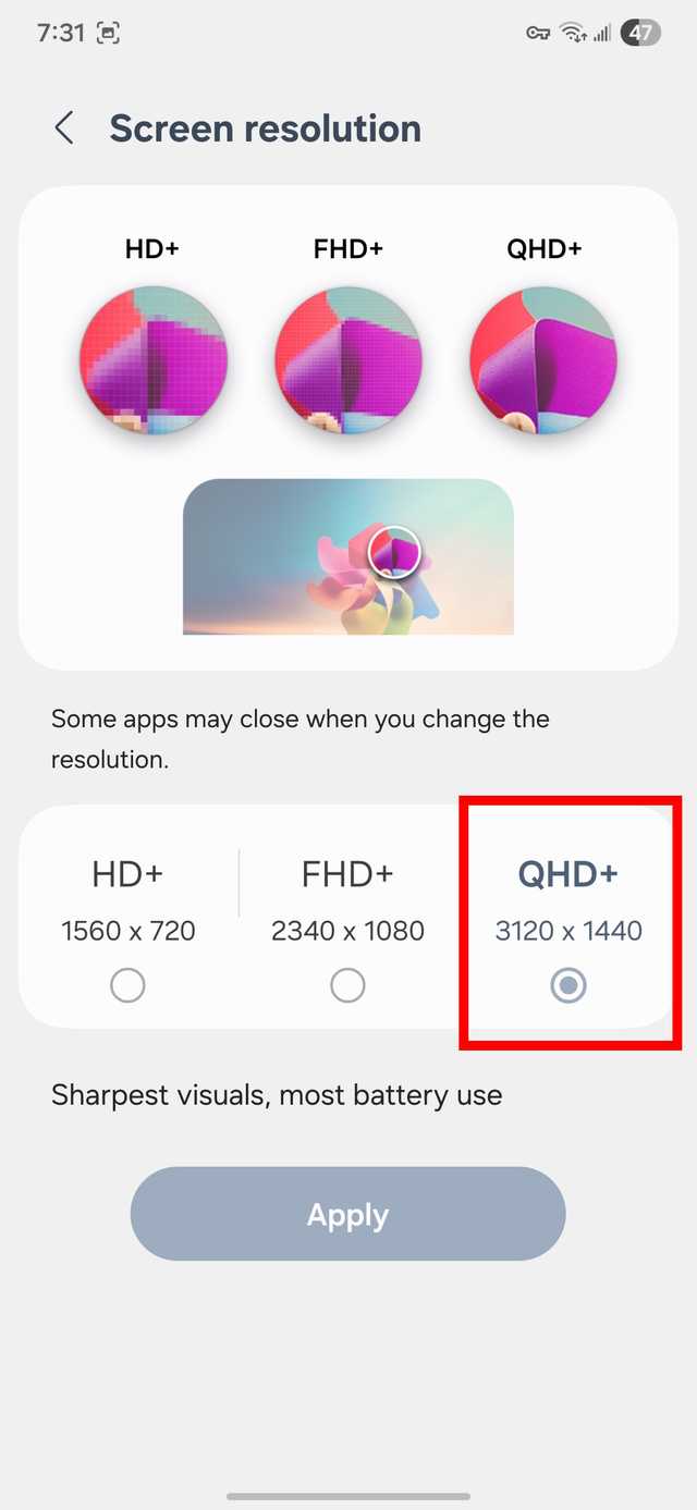 - . Toque no botão de rádio listado abaixo QHD e torneira Aplicar.