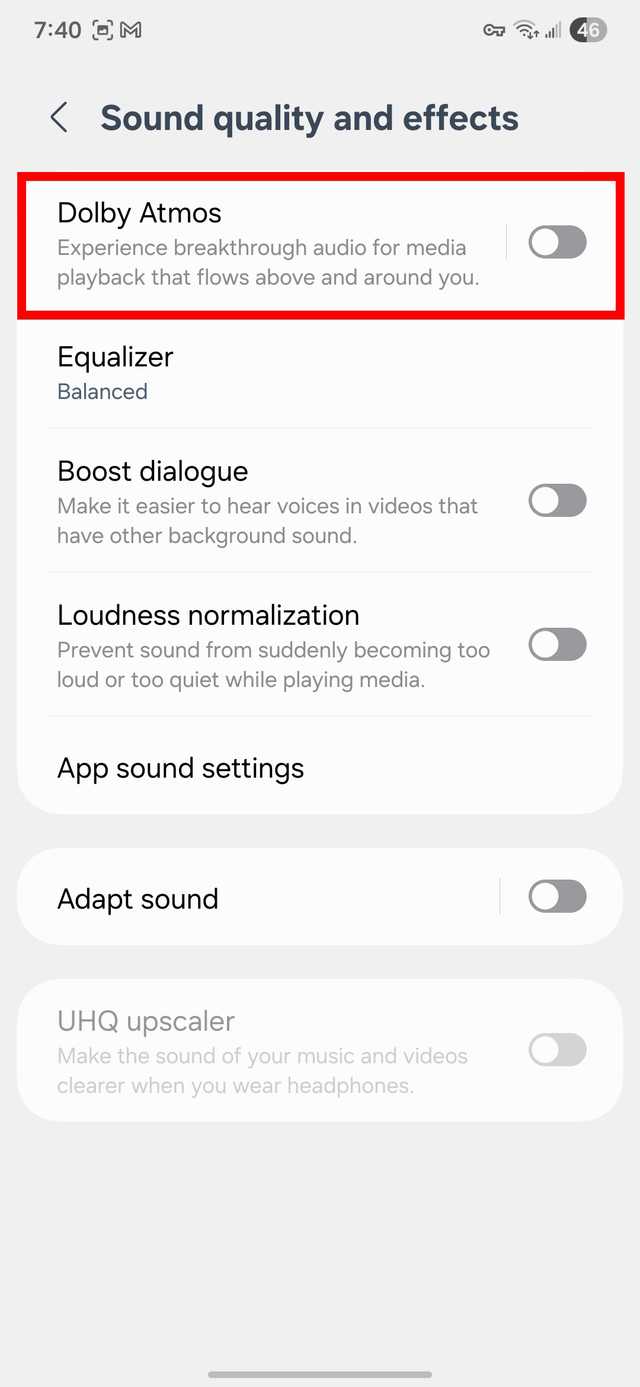 A série Galaxy S24 suporta Dolby Atmos. Dolby Atmos melhora a qualidade do áudio reproduzindo os áudios encenados em um cinema. No entanto, ele está desligado por padrão.