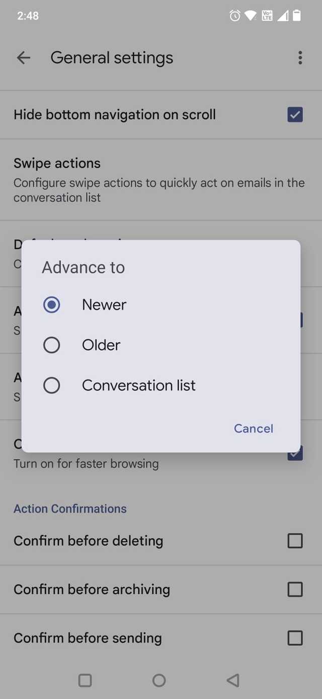 Você encontrará isso em Configurações > Configurações gerais > Avanço automático. Selecione Mais recente. Quando ativado, excluir ou arquivar um e-mail automaticamente puxa o próximo da fila, tornando a limpeza quase fácil.