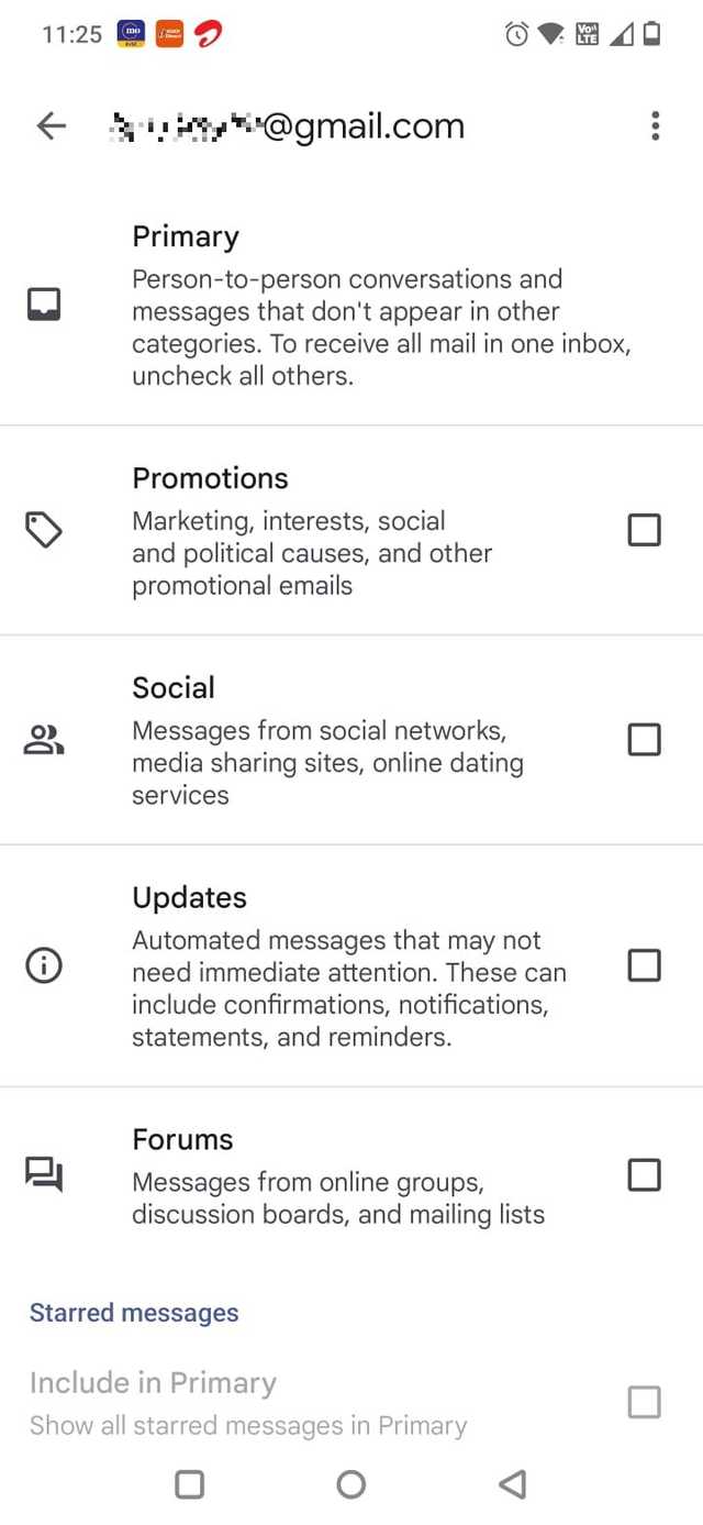 Agora, mantenho tudo na guia Primário. eu vou para Configuraçõesselecione minha conta de e-mail, toque em Categorias da caixa de entradae desmarque tudo, exceto Primário.