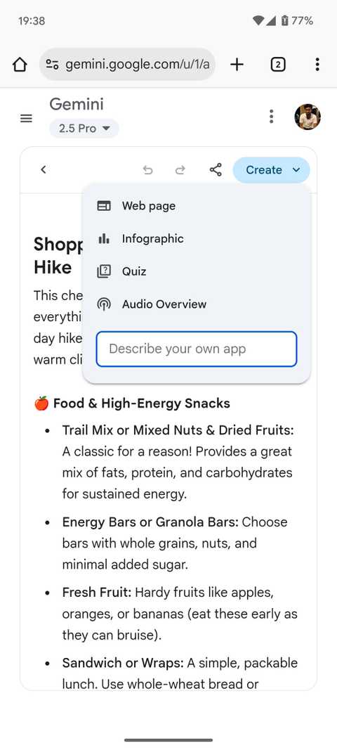 Enquanto visualiza o Google Gemini Beta (Versão 16.31.75.sa.ar64). Um novo Criar O botão (+ ícone) aparece quando você abre o documento/lista feita via tela. Tocar neste ícone mostra um solo oferece opções como Página da Internet” Infográfico” Quiz” Visão geral do áudioE DiferenteSe você está com vontade de experimentar.