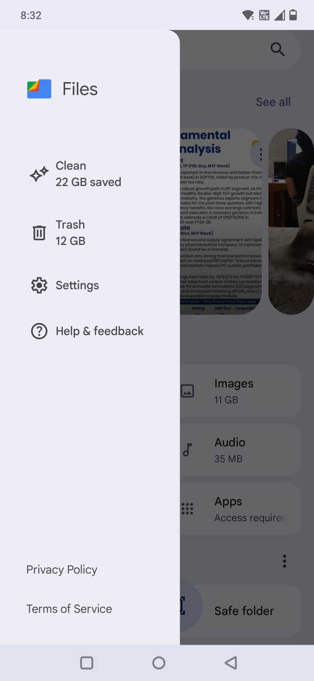 Se você abrir o aplicativo Arquivos, toque no ícone do menu à esquerda e selecione Limparele verifica automaticamente seu dispositivo e categoriza os consumidores de espaço em arquivos grandes, duplicatas, imagens borradas, capturas de tela antigas e arquivos inúteis.
