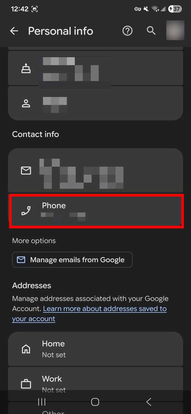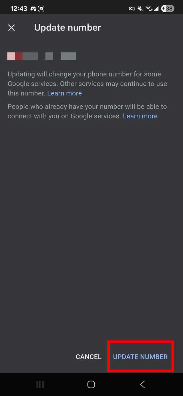 Tocar Selecione. O número de telefone conectado à sua conta do Google é atualizado.