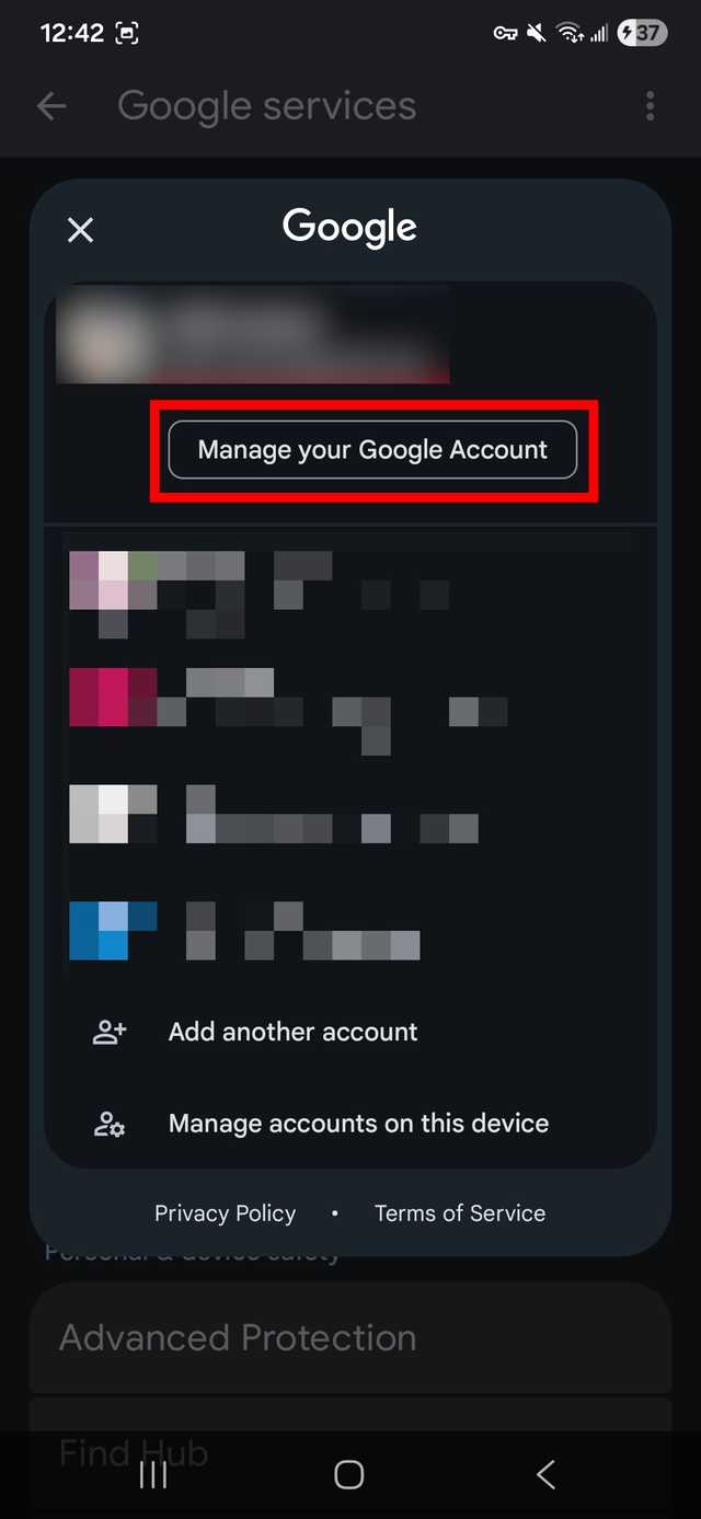 Tocar Gerencie sua Conta do Google para abrir a página de configurações da conta do Google.