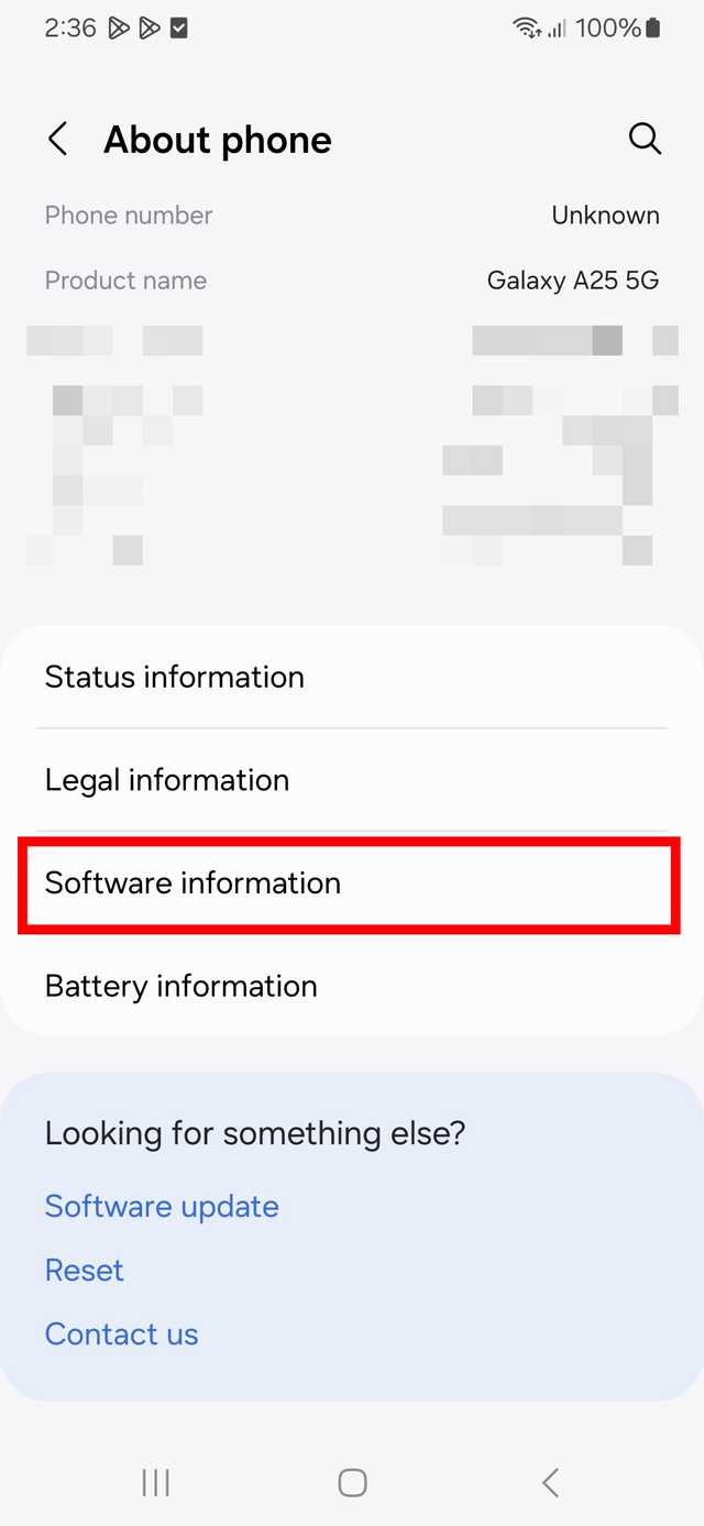 Abra as configurações do seu dispositivo Samsung Galaxy e vá para Sobre o telefone > Informações de software. Passe o dedo sobre Número da versão exibido no Informações de software seção.