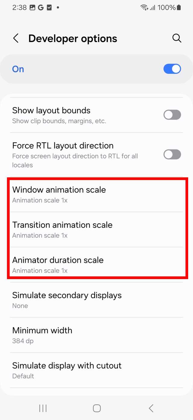 Dentro das configurações do desenvolvedor, você encontrará Escala de animação de janela, Escala de animação de transiçãoe Escala de duração do animador.