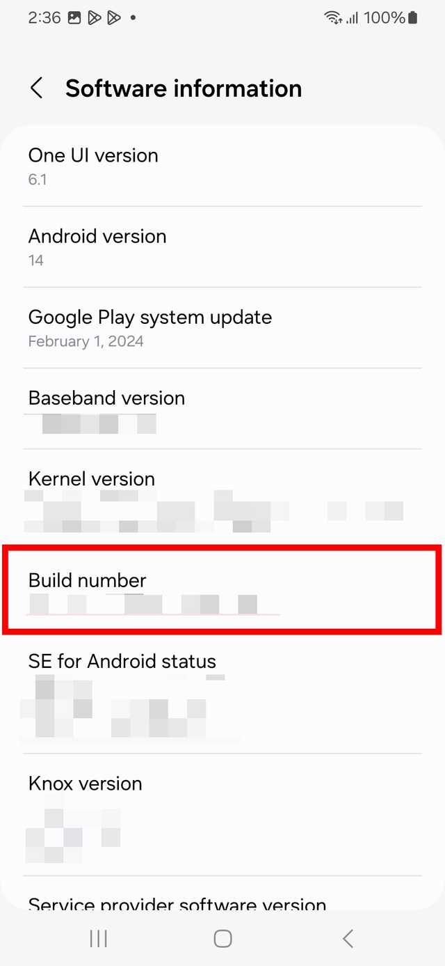 Abra as configurações do seu dispositivo Samsung Galaxy e vá para Sobre o telefone > Informações de software. Passe o dedo sobre Número da versão exibido no Informações de software seção.