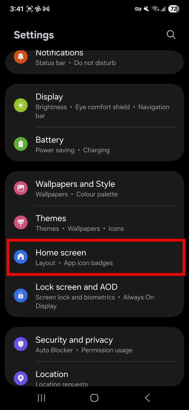 Toque no Alternar para desligar para ligá-lo. Como alternativa, retorne à tela inicial, toque e segure um espaço na tela inicial e selecione Configurações > Mais personalizações (localizado na parte inferior da seção de configurações da tela inicial).