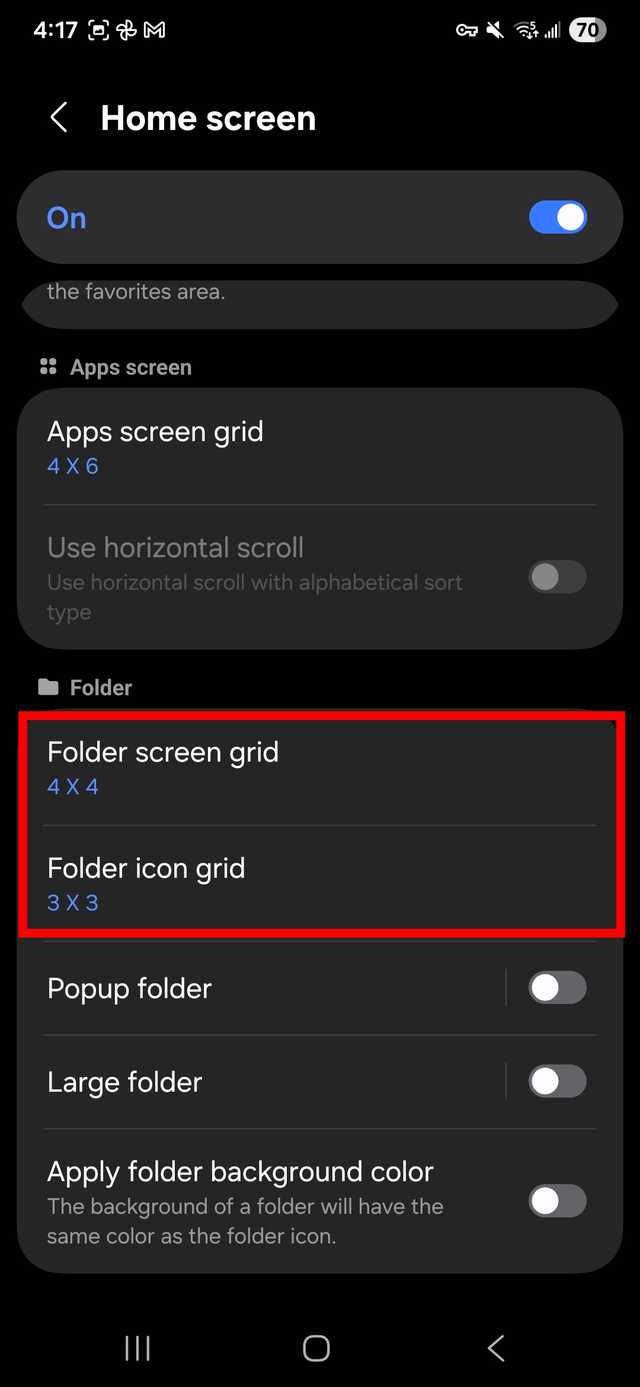 Na mesma página, role para baixo até o Seção de pastae escolha Grade da tela de pastas ou Grade de ícones de pasta para alterar o tamanho.