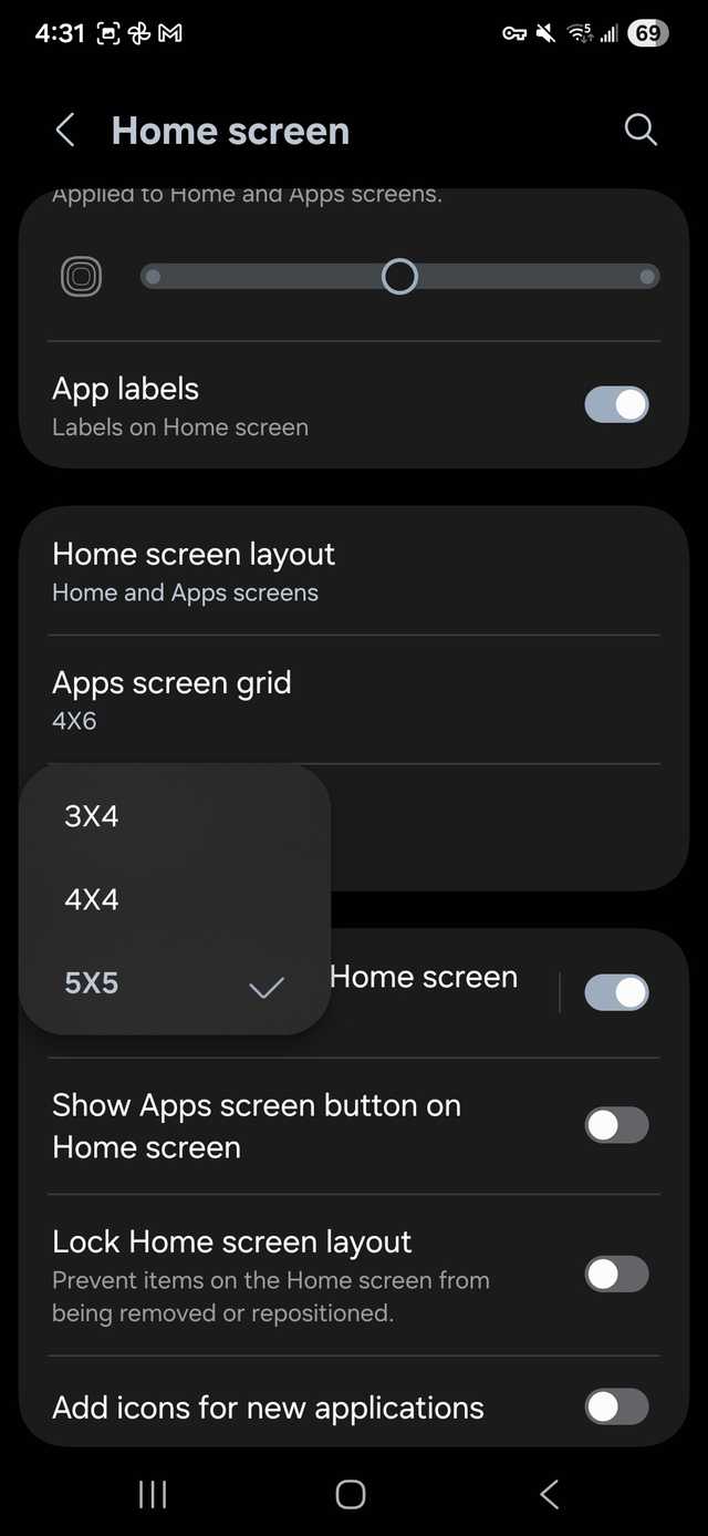 Você também pode retornar ao módulo Home Up, tocar no Grade da tela iniciale ajuste suas opções de grade. As opções de grade recém-adicionadas aparecerão nas configurações normais da tela inicial.