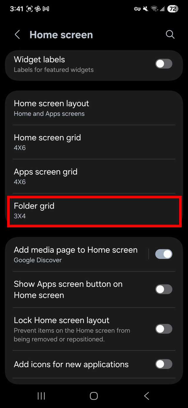 Se desejar alterar quantos aplicativos cabem em uma pasta, retorne às configurações da tela inicial e toque em Grade de pastase escolha outra opção.