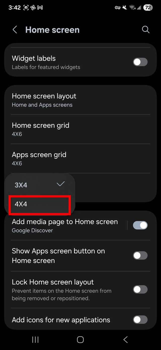 Você também pode retornar ao módulo Home Up, tocar no Grade da tela iniciale ajuste suas opções de grade. As opções de grade recém-adicionadas aparecerão nas configurações normais da tela inicial.