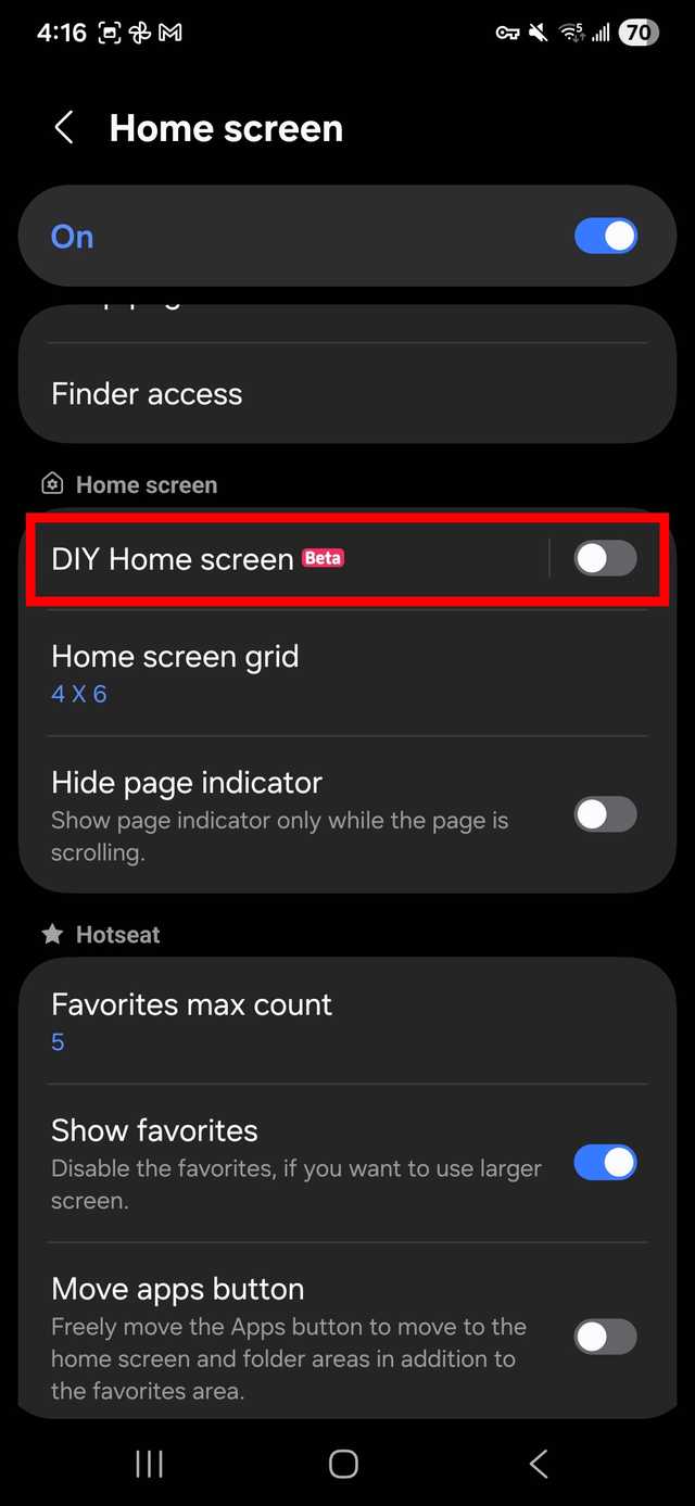 Toque no Alternar para desligar para ligá-lo. Como alternativa, retorne à tela inicial, toque e segure um espaço na tela inicial e selecione Configurações > Mais personalizações (localizado na parte inferior da seção de configurações da tela inicial).
