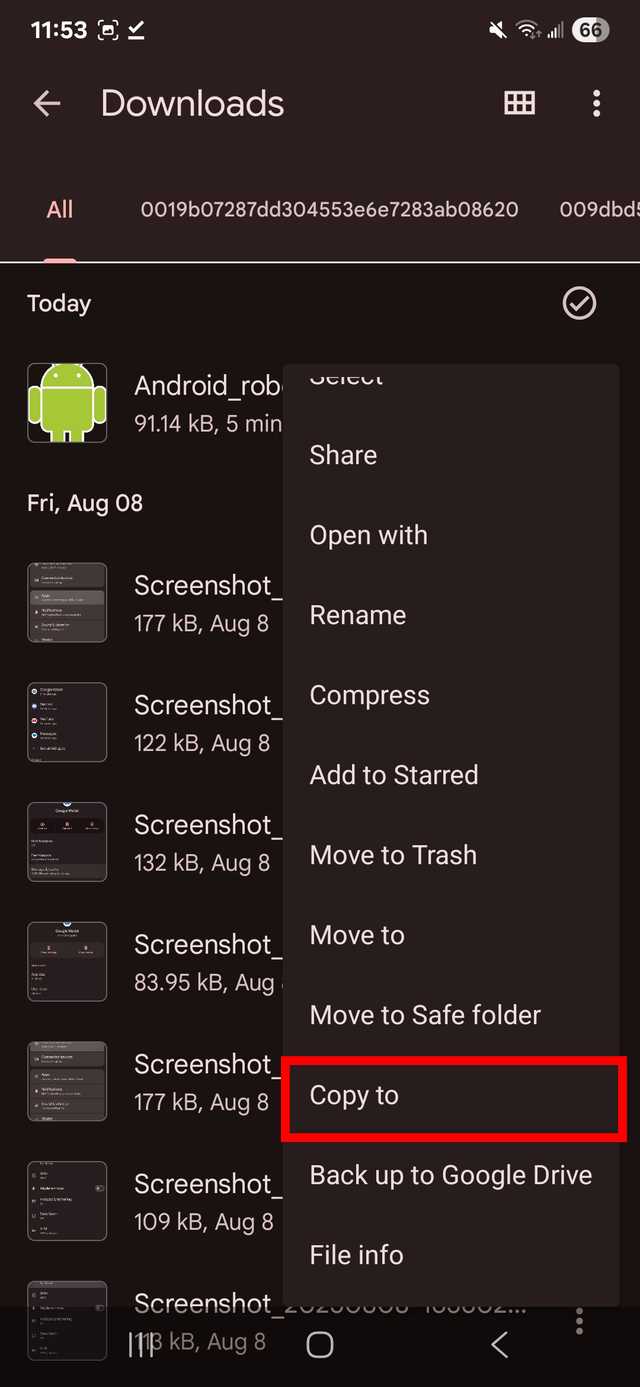 A função Copiar para cria quantas duplicatas você desejar sem remover os arquivos originais da pasta Download.