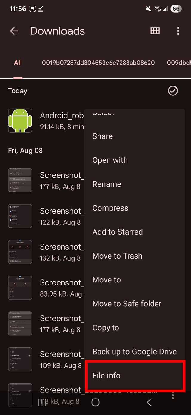 Quando você quiser ver a localização da pasta Download, toque no menu flutuante (os três pontos) ao lado de um dos arquivos baixados e vá para Informações do arquivo.