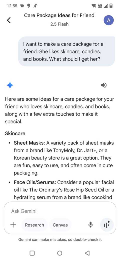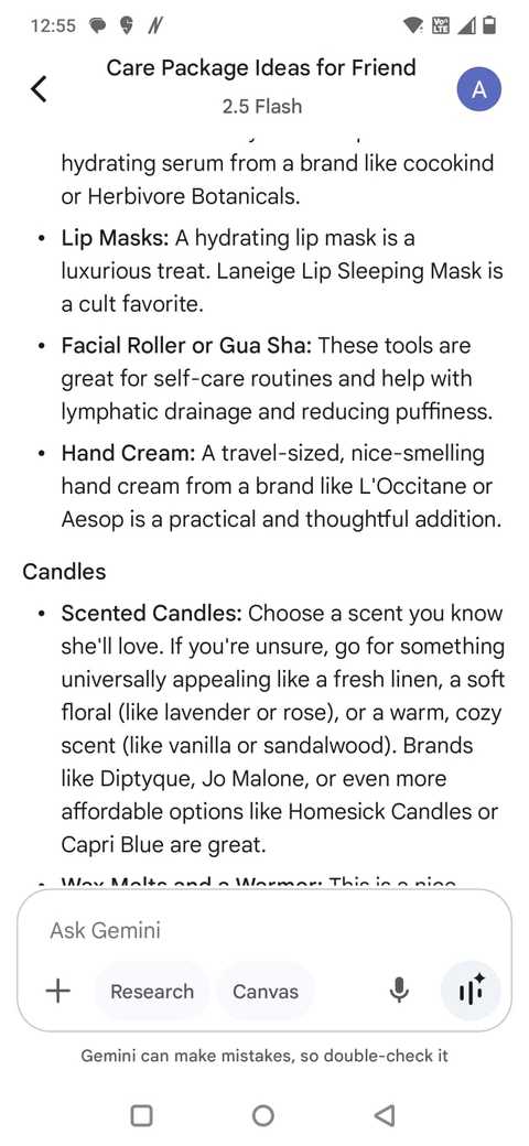 Enquanto preparava um pacote de cuidados para um amigo, Gemini me ajudou a fazer um brainstorming de um tema, comprando idéias para itens atenciosos e sugerindo pequenas empresas das quais eu poderia pedir.