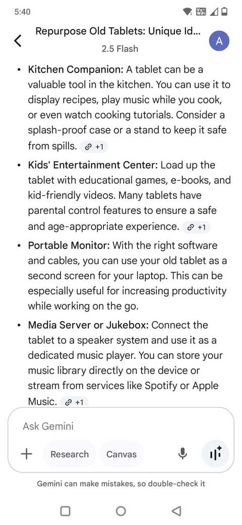 Às vezes, inicio o aplicativo enquanto esperava na fila ou faz uma pausa e jogando fora um aviso rápido, como: “Quais são algumas maneiras únicas de re -usar meu tablet antigo?” Ou “O que é uma maneira divertida de automatizar minha rotina matinal?”