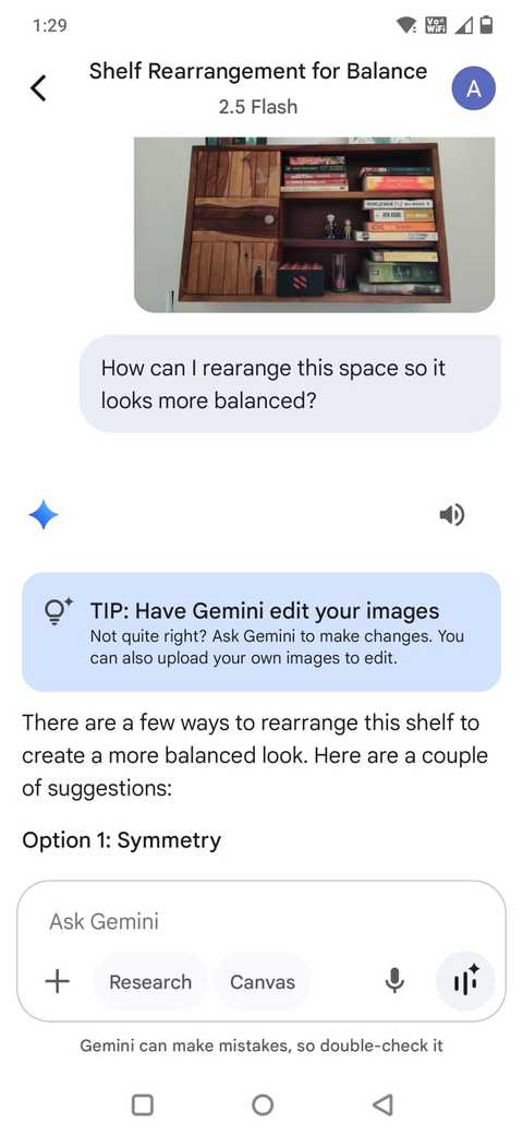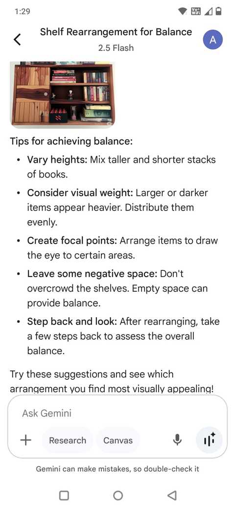 É quando eu chego Gemini no meu telefone. Estou exatamente onde estou preso: “Não sei como controlar essas prateleiras para que elas pareçam equilibradas”, ou “quero adicionar algo funcional a esse ângulo sem mexer com ele”.