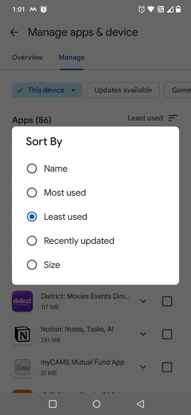 Eu também entrei Google Play Store e selecionado Gerenciar aplicativos e dispositivos > Gerenciar > Ordenar por: Menos usadoo que me deu uma lista cronológica.