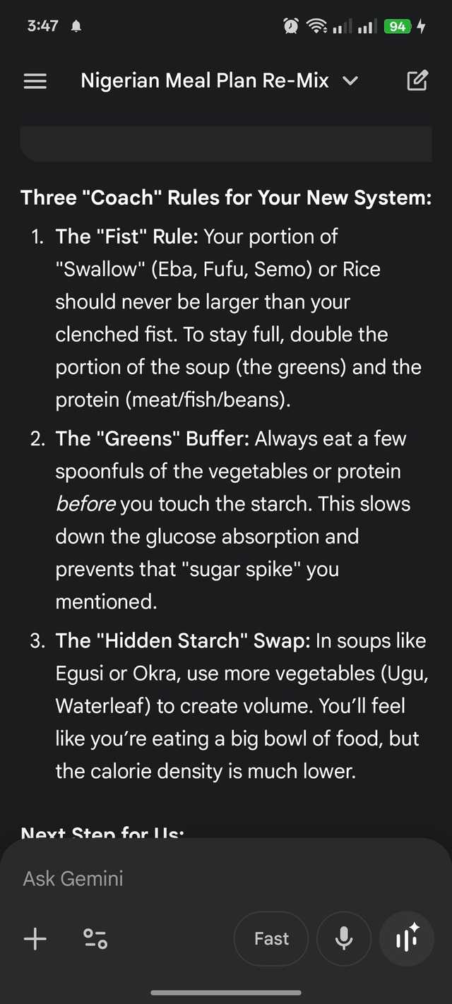 Essa percepção precoce me incentiva a comer com mais responsabilidade. Usando o Gemini da maneira esperada me ajudou a descobrir planos de refeições para adultos.
