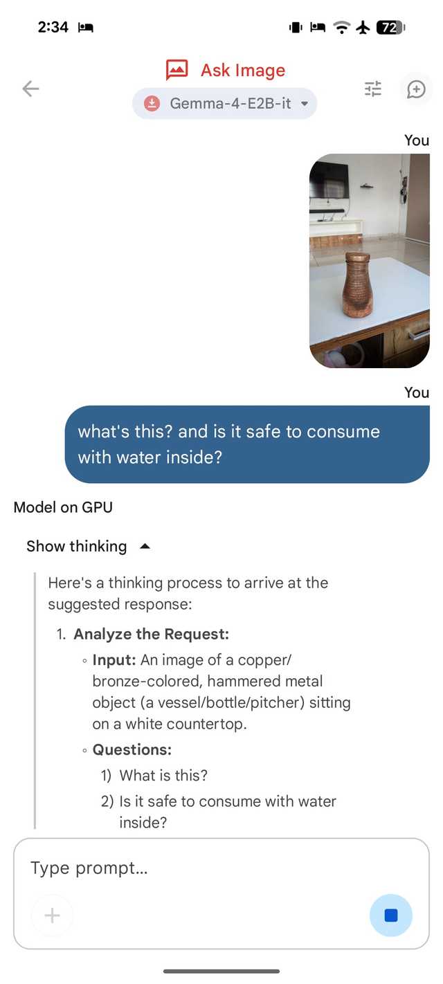 A multimodalidade nativa é onde isso realmente se destaca para minhas consultas em trânsito. Se vejo um diagrama complexo ou uma nota manuscrita, tiro uma foto. Usando o modo ‘Ask Image’, o E2B analisa o visual e extrai dados estruturados.