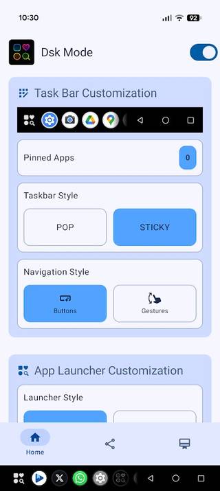 O Modo Dsk adiciona uma barra de tarefas estilo desktop na parte inferior do telefone.
