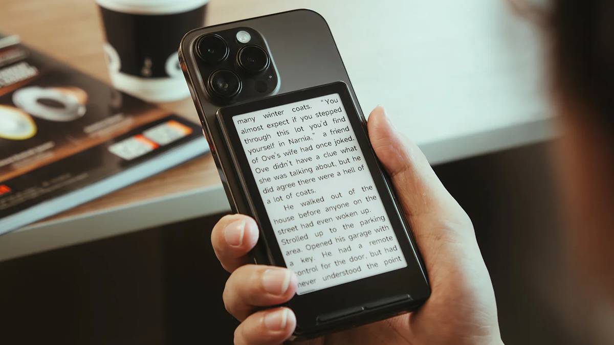 O Xteink X4 leva essa filosofia para o próximo nível. Não é apenas um pequeno e-reader, mas também inclui um ímã MagSafe. Isso significa que ele pode ser conectado magneticamente à parte traseira de um telefone compatível, tornando ainda mais fácil ler um pouco a qualquer momento.