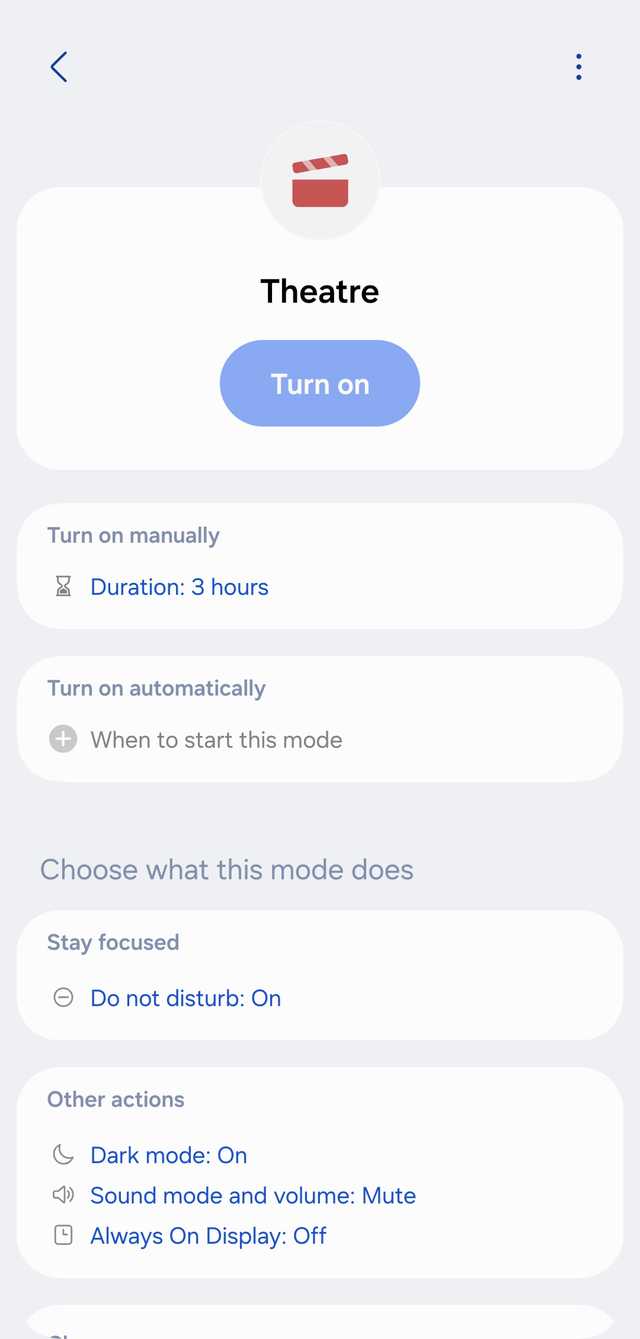 No meu caso, configurei-o para automatizar várias configurações no meu telefone Samsung. Quando eu habilito o modo Teatro, ele desativa Always on Display, coloca meu telefone em DND por três horas, bloqueia notificações e chamadas de todos (exceto meus pais) e ativa o modo escuro.