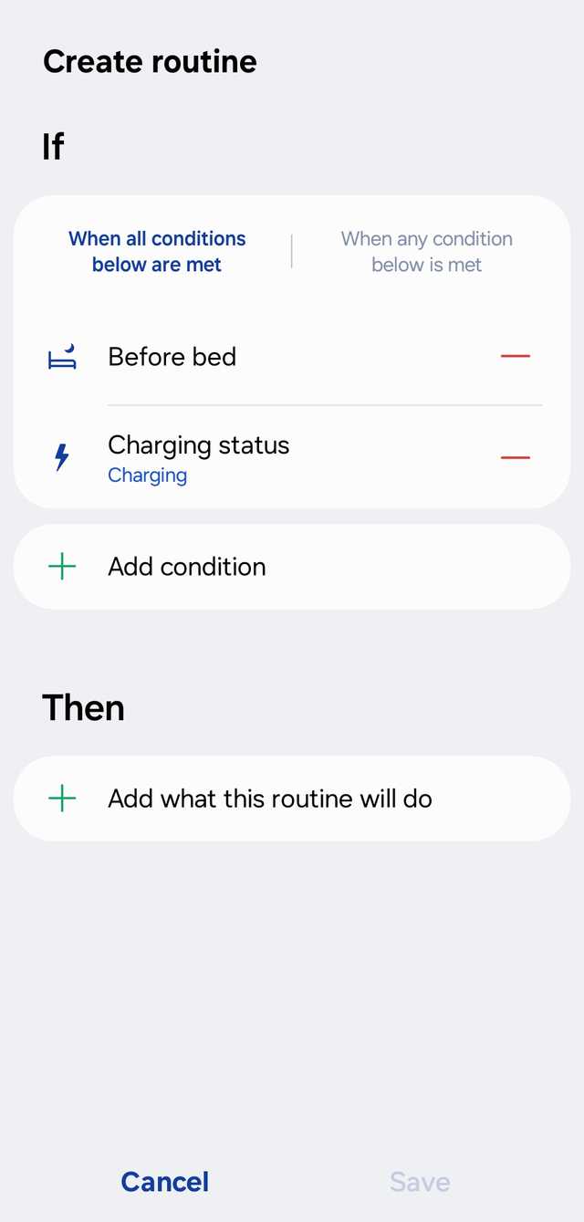 Eu defini uma rotina de sono profundo que é acionada com base no horário (1h às 9h), mas você também pode vinculá-la quando começar a carregar o telefone à noite.