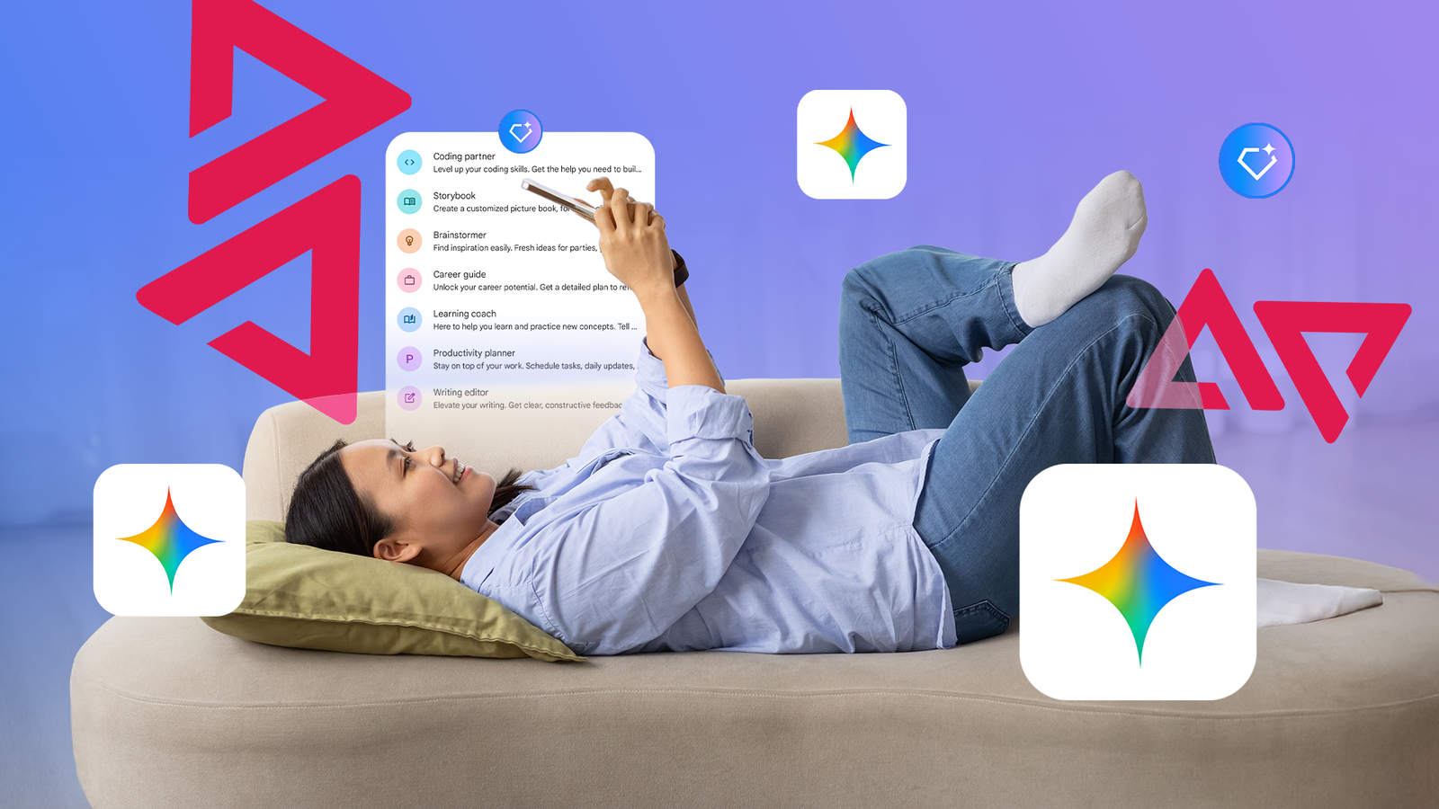 Uma mulher sentada em um sofá usando o telefone, cercada pelos logotipos do Gmail, Drive, Docs, YouTube e Gemini.