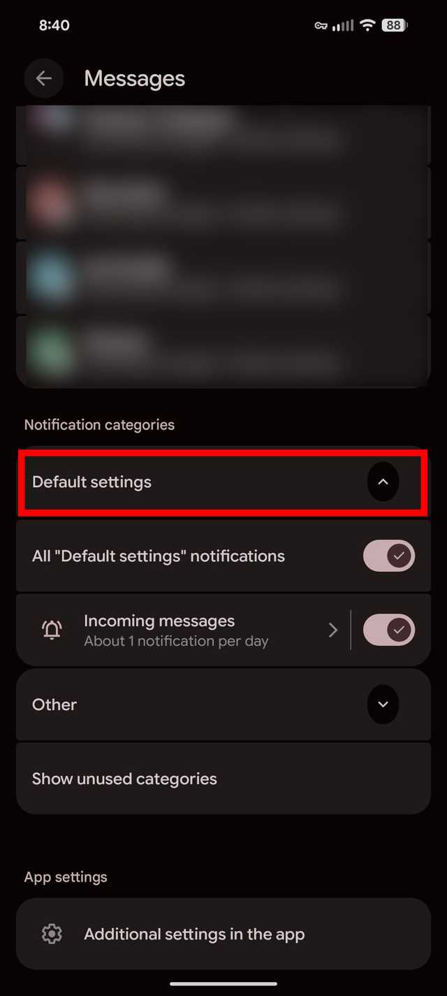 - . Role até Configurações padrão e torneira Mensagens recebidas. Se você não vir essa opção, escolha Comportamento, áudio e muito mais, ou Categorias de notificação.