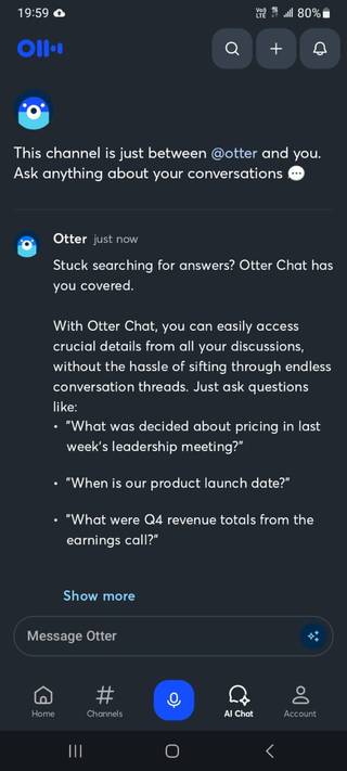 Otter lida com isso de maneira muito diferente. O AI Chat está incluído no plano gratuito, juntamente com transcrições e resumos em inglês, francês ou espanhol. Ainda há um limite para consultas de bate-papo de IA, mas os resumos não são bloqueados.