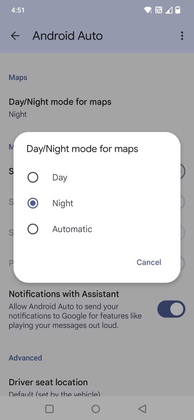 Para configurá-lo, acesse as configurações do Android Auto no seu telefone, role para baixo até o Mapas seção, toque em Modo Dia/Noite para mapase selecione Noite.