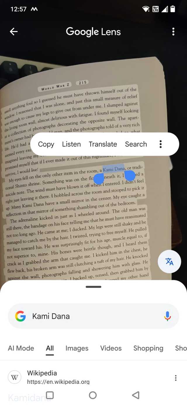 É por isso que você pode arrastar o dedo por um parágrafo impresso e destacá-lo. Quando destacado, o Lens permite copiar o texto, ouvi-lo, traduzi-lo ou pesquisá-lo no Google.
