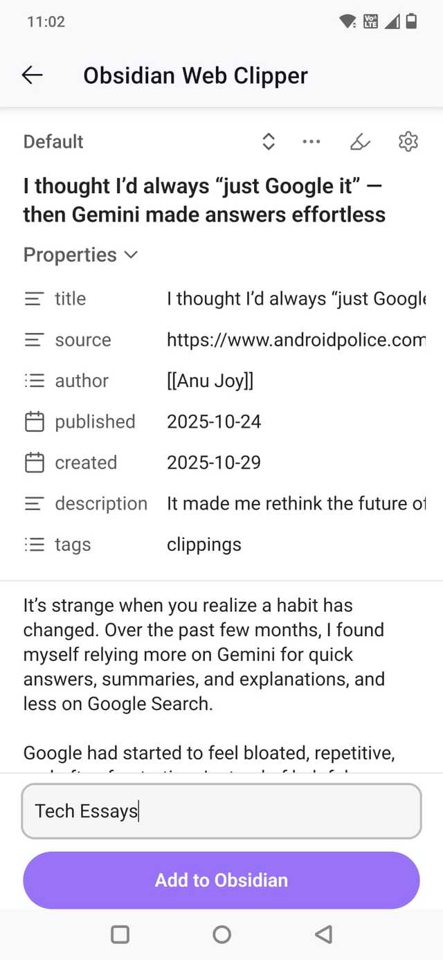 Agora, quando encontro algo que vale a pena salvar, seja um longo artigo técnico, um ensaio ou uma postagem de nicho no Reddit, coloco-o direto no meu cofre Obsidian.