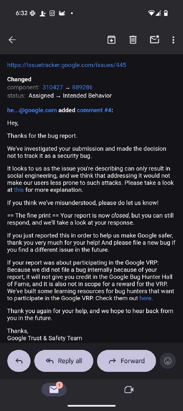 Apesar dos claros efeitos de proteção, o Google decidiu não resolver o problema. Em reação ao histórico da FireTail, a empresa categorizou o contrabando ASCII como um problema de “design social” em oposição a uma suscetibilidade tecnológica. Em termos menos complexos, o Google recomenda que o problema ocorra devido ao engano de indivíduos, e não a um problema no layout do design.