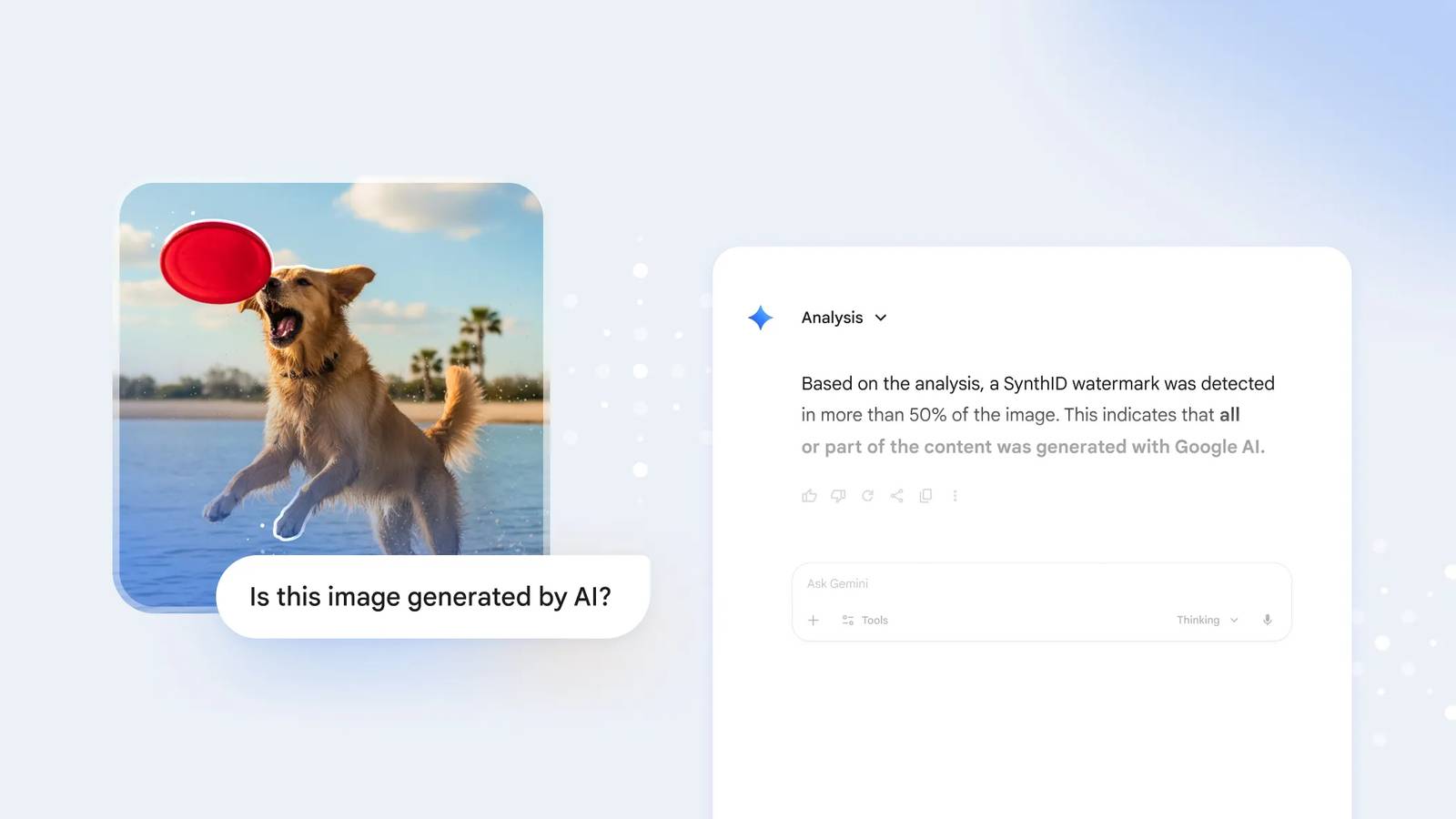 Se você vir uma imagem on-line, ou receber uma, e quiser confirmar suas origens, basta carregá-la no aplicativo Gemini e perguntar: “isso foi criado pela IA do Google?” ou “Isso é gerado por IA?”