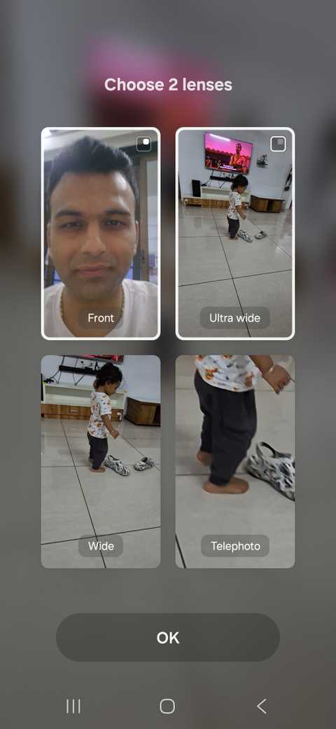 O que faz com que essa função seja uma potência criativa é como a Samsung a desenvolveu. Em modelos mais recentes, posso ir além das câmeras frontal e traseira. Eu posso combinar câmeras traseiras diferentes para capturar dois níveis de zoom ao mesmo tempo.