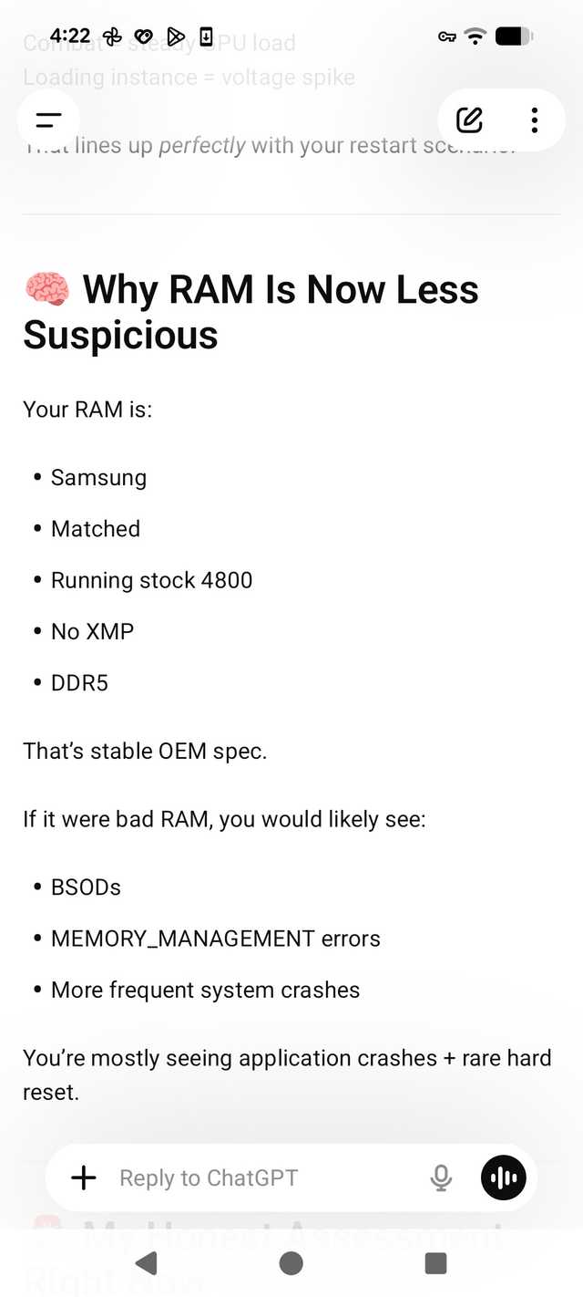 Principalmente porque era raro meu computador reiniciar ou ficar preto, mas aconteceu. Como as falhas da PSU (tela preta, reinicializações do computador) eram menos comuns do que as falhas do meu aplicativo, o ChatGPT não considerou a PSU uma causa provável.