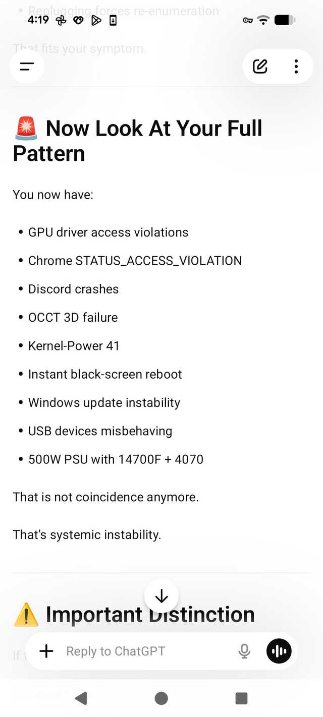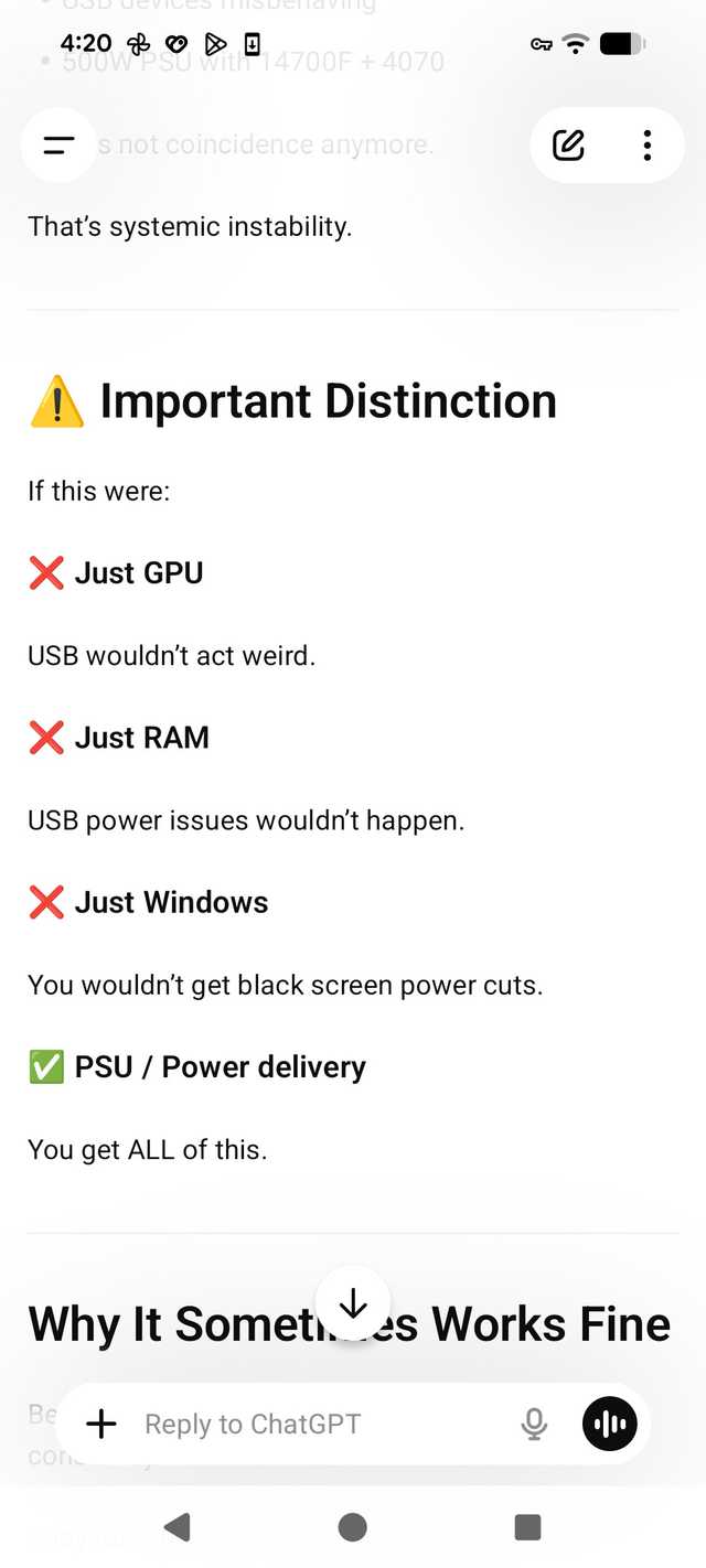 Principalmente porque era raro meu computador reiniciar ou ficar preto, mas aconteceu. Como as falhas da PSU (tela preta, reinicializações do computador) eram menos comuns do que as falhas do meu aplicativo, o ChatGPT não considerou a PSU uma causa provável.