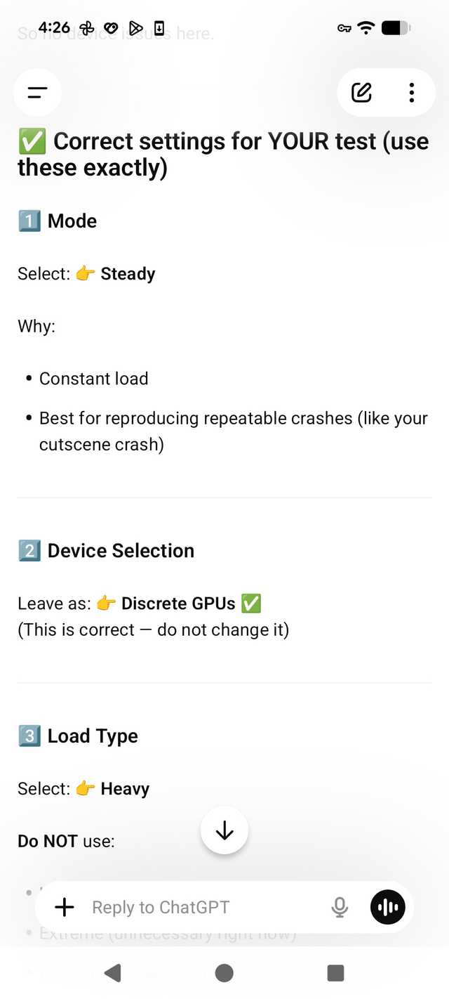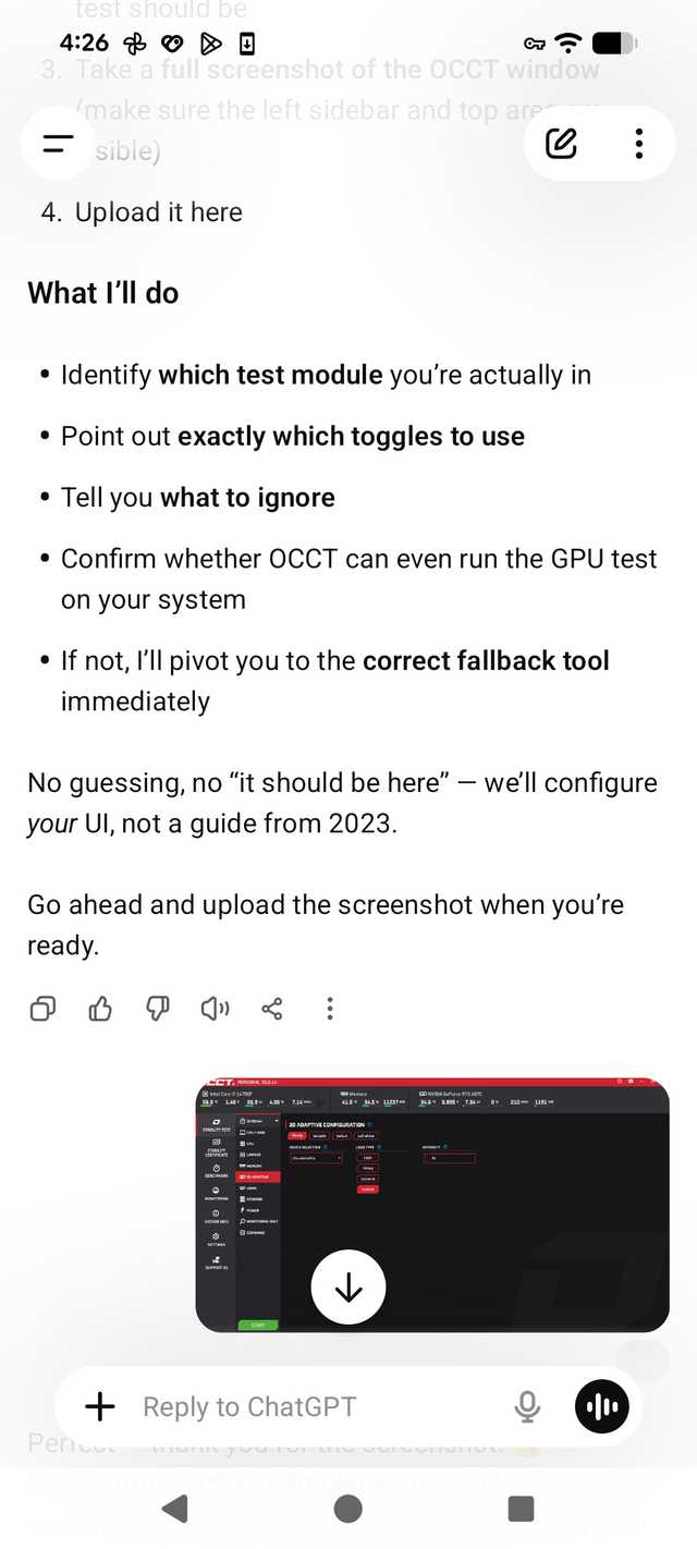 Após alguns testes, o chatbot e eu concluímos que não era um problema de driver. Então analisamos os testes de hardware. Baixei o OCCT, mas descobri que o guia fornecido pelo ChatGPT estava desatualizado.