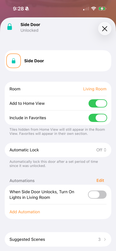 A detecção do status da porta também é exibida no app Home, representando uma melhoria significativa em relação aos modelos mais antigos. Se a porta não estiver totalmente fechada, a fechadura não tentará travar automaticamente. Você também pode criar automações em torno disso. Por exemplo, envie um alerta se a porta permanecer aberta após dez minutos ou desligue automaticamente as luzes próximas à entrada quando a porta fechar.