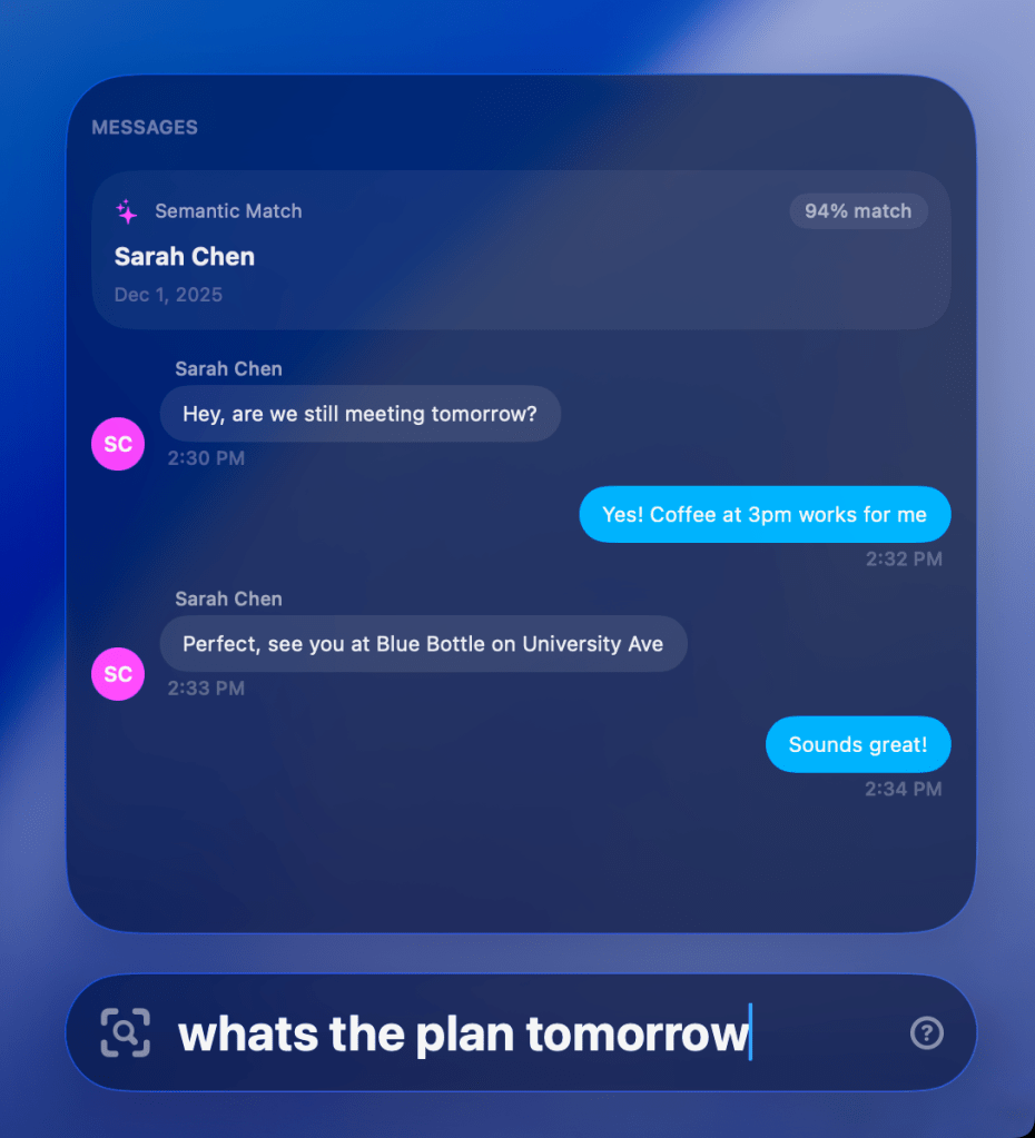 A pesquisa semântica para mensagens e arquivos usa um modelo no dispositivo otimizado para Apple Silicon, utilizando o Neural Engine – e realmente funciona. Ao contrário da pesquisa de mensagens, que muitas vezes não é confiável, o Vector mostrará o que você está procurando. Você pode pesquisar por palavras-chave ou inserir uma frase ou pergunta geral e ele encontrará os textos relevantes. O mesmo vale para arquivos.